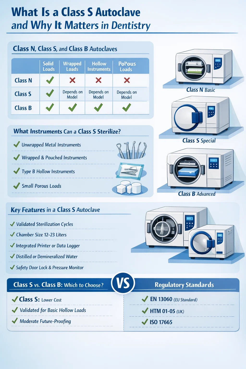 Een klasse S-autoclaaf is een stoomsterilisator die is ontworpen om een specifiek, door de fabrikant gedefinieerd bereik van ladingen aan te kunnen - wat qua sterilisatieprestaties tussen de basisklasse N en de volledig capabele klasse B ligt. In de tandartspraktijk wordt de klasse S-autoclaaf is een van de meest gebruikte sterilisatie-eenheden , omdat het een praktisch evenwicht biedt tussen kosten, cyclussnelheid en de mogelijkheid om holle en poreuze instrumenten te verwerken, wat standaard is in elke tandheelkundige kliniek.