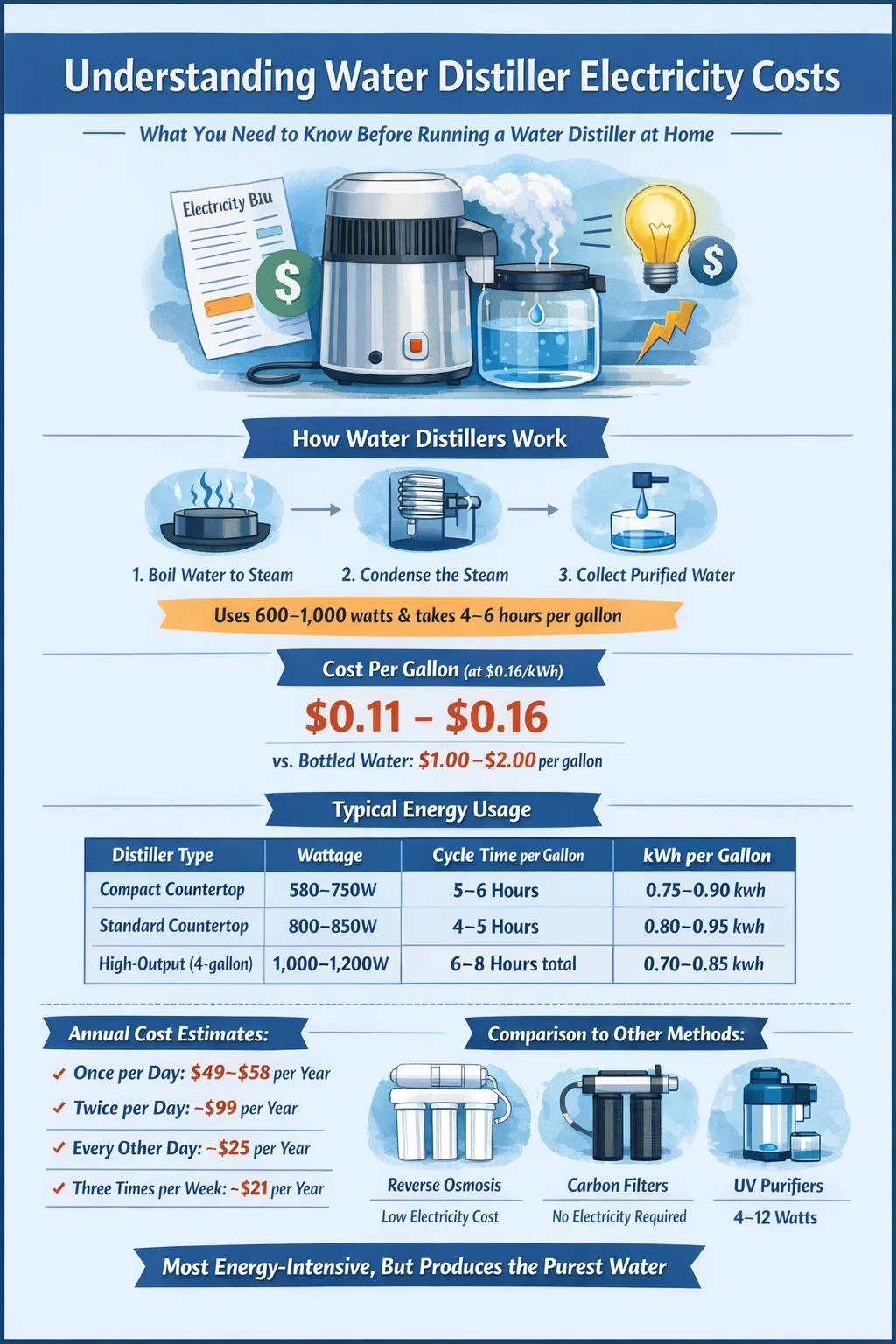 Laten we de echte jaarlijkse kostencijfers op tafel leggen, want abstracte wattagecijfers betekenen niet veel totdat u ziet wat ze met uw elektriciteitsrekening doen. In de onderstaande berekeningen wordt uitgegaan van een standaard waterdestilleerder van 850 W die 0,85 kWh per gallon verbruikt en het hele jaar door op verschillende frequenties draait.