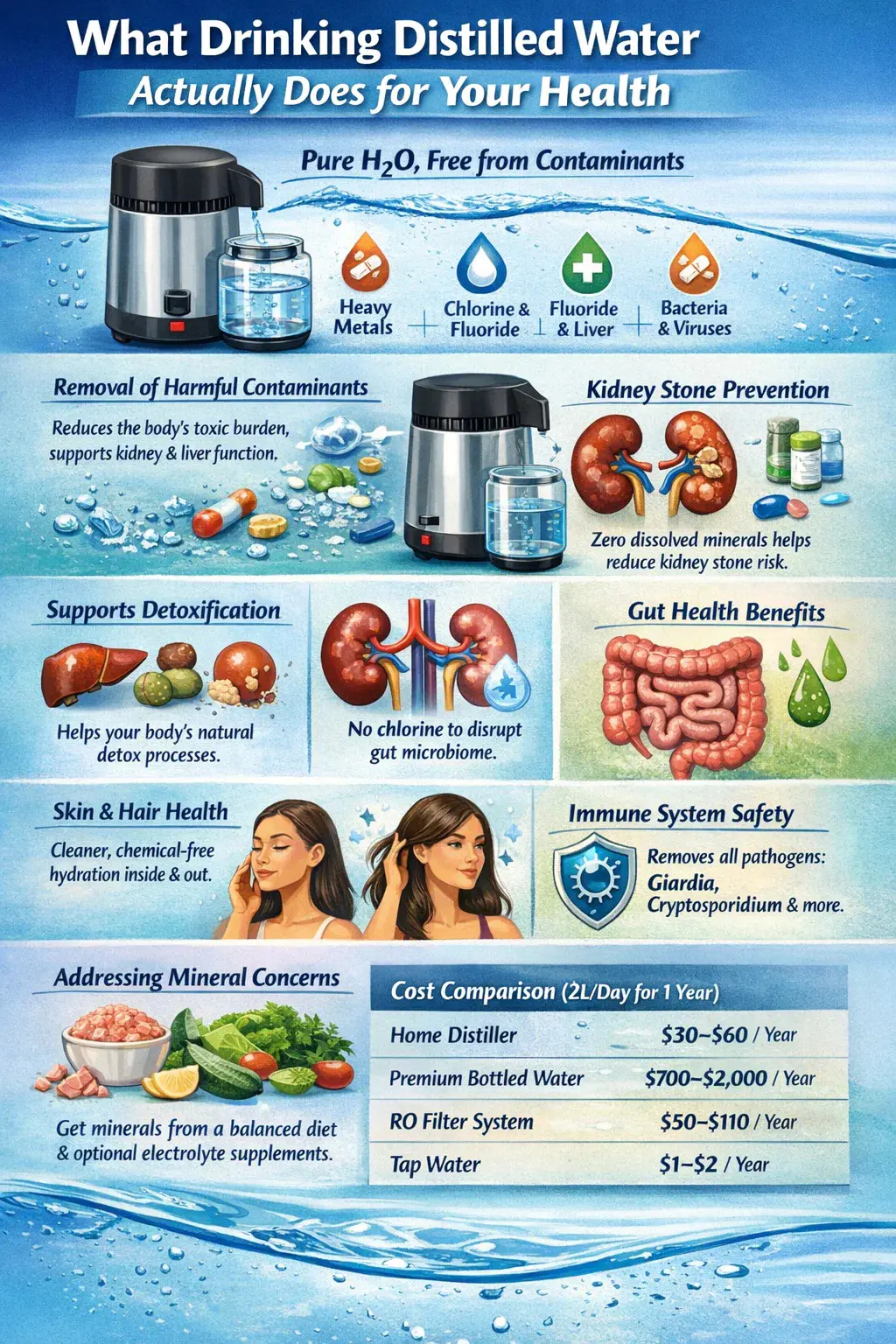 De gezondheidsvoordelen van het drinken van gedestilleerd water zijn reëel, maar het zijn vooral de voordelen van afwezigheid: de afwezigheid van verontreinigende stoffen, ziekteverwekkers, ongewenste mineralen en chemische toevoegingen. Dit is geen kleinigheid. Gezien het feit dat de gemiddelde persoon grofweg consumeert 700–1.000 liter water per jaar is het cumulatieve verschil tussen consistent schoon water en verontreinigd water gedurende een heel leven aanzienlijk.