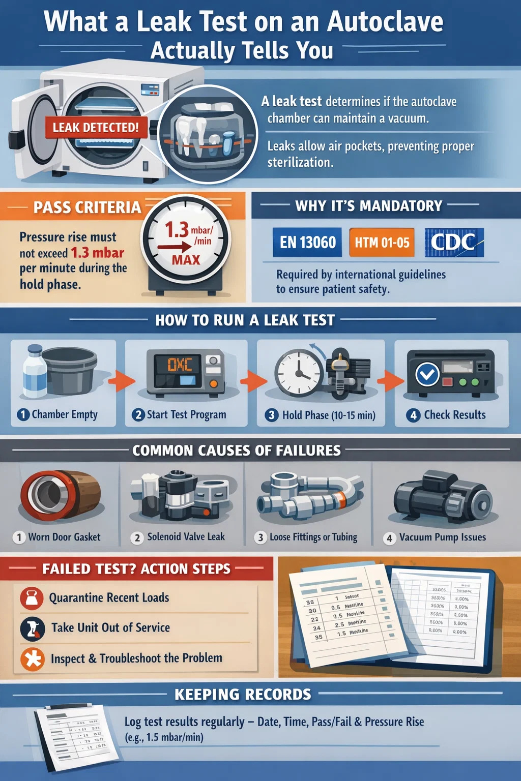 De pass/fail-benchmark voor de meesten tandheelkundige autoclaaf modellen is een drukstijging van niet meer dan 1,3 mbar (0,13 kPa) per minuut tijdens de vasthoudfase van de lektest. Sommige fabrikanten hanteren een strengere limiet van 1,0 mbar per minuut. Elke waarde boven de door de fabrikant aangegeven drempel betekent dat de cyclus niet mag doorgaan totdat de bron van het lek is geïdentificeerd en gecorrigeerd.
