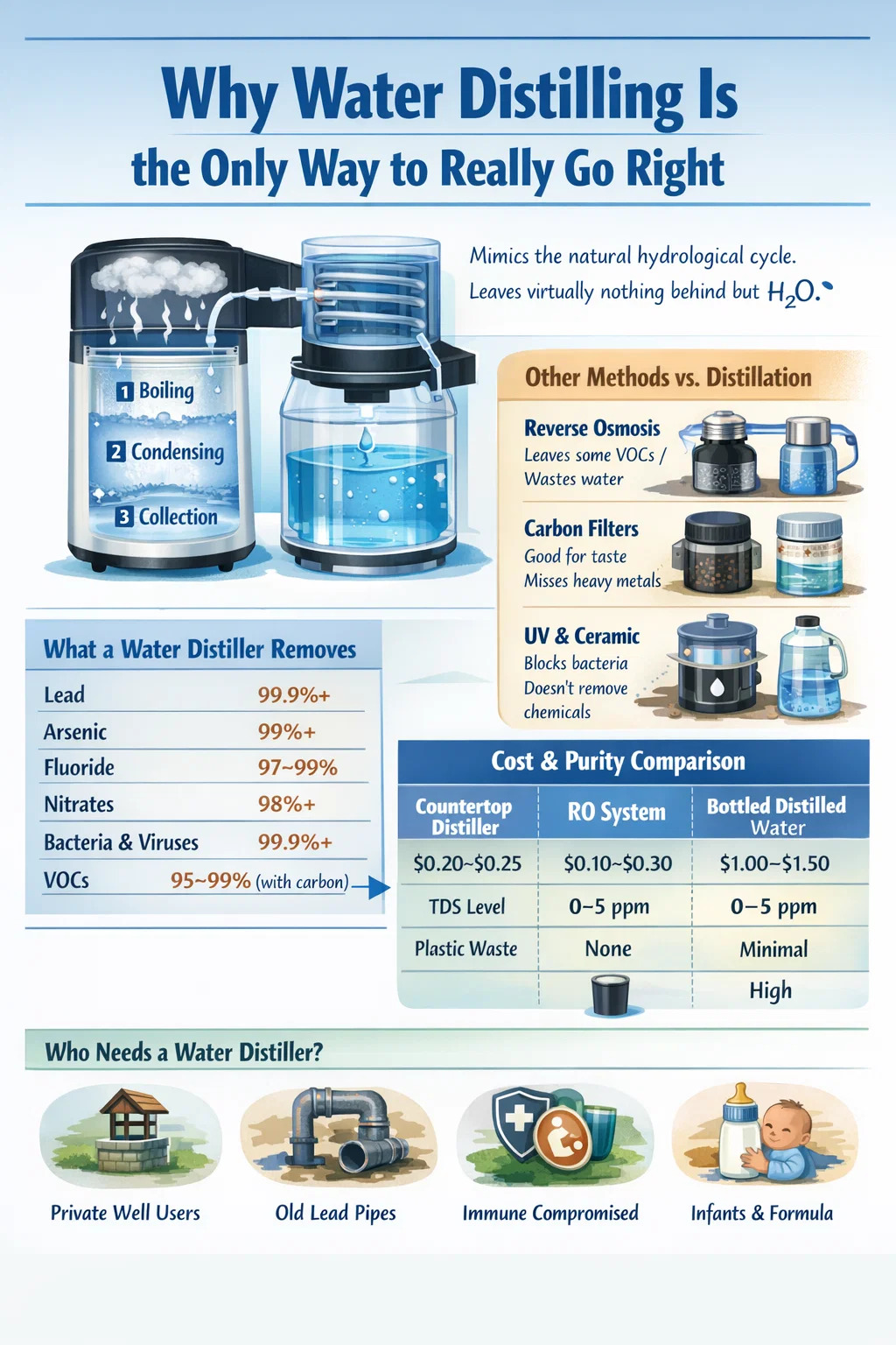 Als u enige tijd heeft besteed aan onderzoek naar waterzuivering, bent u waarschijnlijk omgekeerde osmosefilters, actieve koolblokken, UV-sterilisatoren en keramische filters tegengekomen. Ze beloven allemaal schoon water. Sommigen van hen doen behoorlijk werk bij het verwijderen van specifieke verontreinigingen. Maar geen van hen komt in de buurt van wat een waterdestilleerder eigenlijk doet. Als mensen zeggen dat waterdistilleren de enige manier is om echt goed te gaan, zijn ze niet dramatisch. Ze beschrijven een fysisch proces dat de hydrologische cyclus nabootst en vrijwel niets achterlaat behalve H₂O-moleculen.