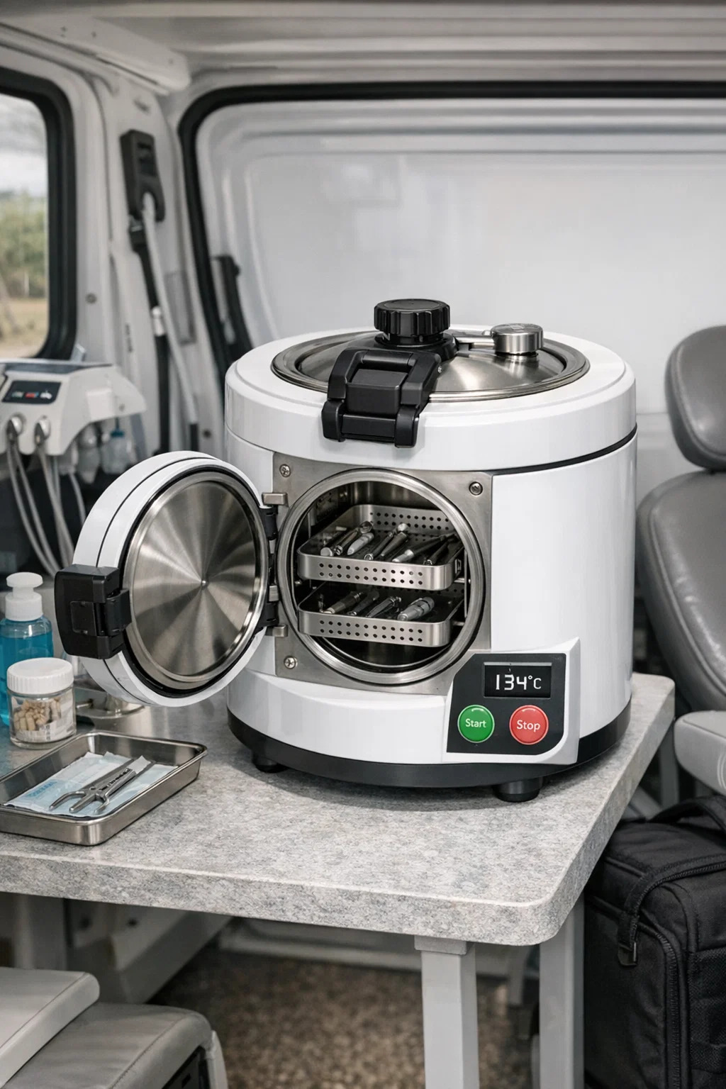 Back-upapparatuur: Deze kan tijdelijk worden aangevuld wanneer de grote draagbare tandheelkundige autoclaaf van de kliniek defect is of in reparatie is, waardoor een ononderbroken werking wordt gegarandeerd.