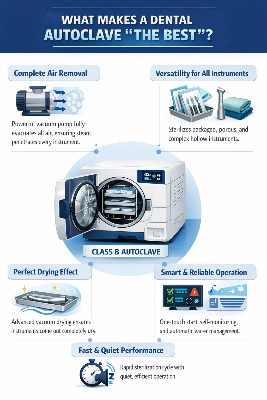 Het beoordelen of een tandheelkundige autoclaaf tot de categorie ‘beste’ behoort, kan vanuit de volgende praktische perspectieven:
