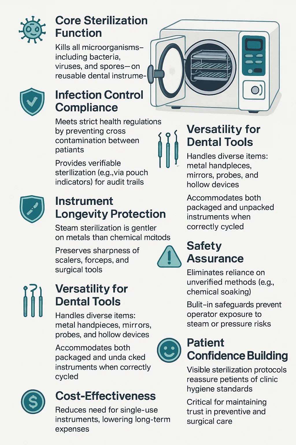 | Steriliseert instrumenten | Vernietigt alle bacteriën, virussen en sporen | Zorgt ervoor dat gereedschappen biologisch veilig zijn voor hergebruik |